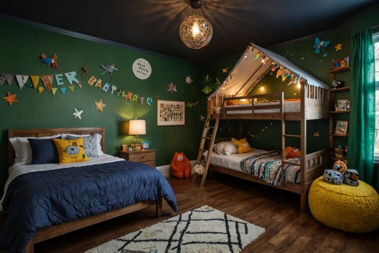 Diese kreative Zimmergestaltung kombiniert stilvolle Dekorationselemente mit kindgerechter Funktionalität und bietet so eine perfekte Balance zwischen Spielspaß und gemütlichem Ambiente.