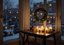 Der Eingangsbereich neben der Haustür ist der erste Ort, an dem Gäste die festliche Atmosphäre der Adventszeit wahrnehmen. Eine gekonnte Kombination aus Glaselementen und Holzaccessoires schafft hier eine einladende und moderne Stimmung. Ein Willkommenskranz aus Naturholz bildet die Grundlage, die mit filigranen Glasornamenten und Lichterketten stilvoll ergänzt wird. Glas kann als Transparentkunst die Leichtigkeit und Helligkeit der Dekoration unterstreichen, während Holz für Wärme und Natürlichkeit sorgt. So entsteht ein harmonisches Zusammenspiel, das perfekt zu zeitgemäßen Wohnambientes passt. Kerzenhalter aus Glas mit warmweißem Licht reflektieren sanft die Holzmuster im Kranz und setzen gezielte Akzente. Zusätzliche Dekoartikel wie kleine Holzfiguren oder Glassterne verleihen der Dekoration Persönlichkeit und Tiefe. Diese Kombination fördert nicht nur ein behagliches Ambiente, sondern auch die Verbindung zwischen Naturmaterialien und modernem Design – ideal für das Entrée eines stilbewussten Haushalts in der Adventszeit.