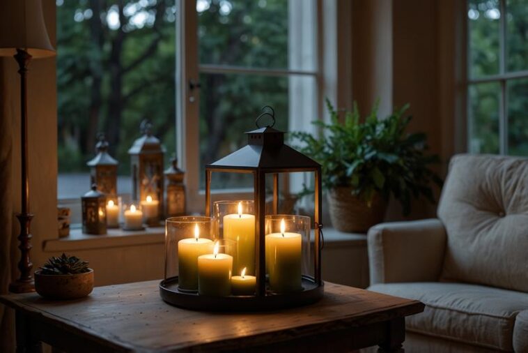 Couchtisch-Arrangement mit Kerzen in Windlichtern