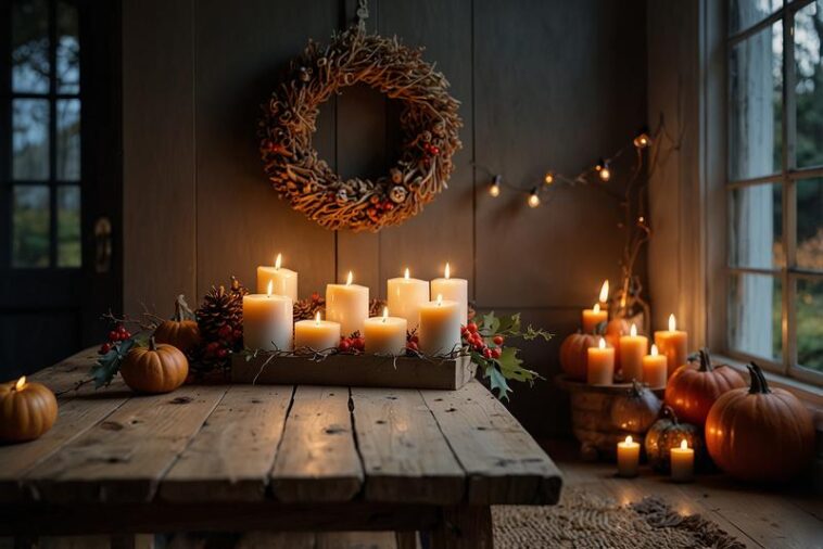 Herbstdekoration mit Kürbissen, Eichenlaub und Kerzen