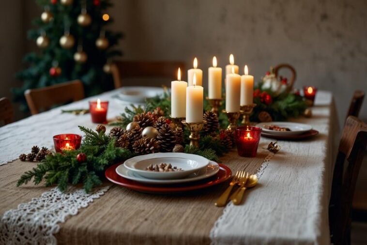 Ein festlich gedeckter Weihnachtstisch gewinnt mit einem Meer aus Kerzen und frischem Tannengrün an Atmosphäre und Stil. Kerzen spenden nicht nur warmes Licht, sondern schaffen durch ihr flackerndes Leuchten eine behagliche und einladende Stimmung. Besonders beliebt sind LED-Kerzen als sichere Alternative zu echten Flammen, die lange Freude bereiten, ohne Gefahr eines Brandes. Tannenzweige und -grün verbreiten nicht nur den lieblichen Duft des Waldes, sondern ergänzen die Dekoration mit einer natürlichen und festlichen Note. Sie eignen sich ideal, um den Mittelstreifen des Tisches zu schmücken oder als kleine Arrangements in Kombination mit roten Beeren und kleinen Zapfen verteilt zu werden. Die Kombination aus Naturmaterialien und sanftem Kerzenlicht symbolisiert die Winterzeit und das Weihnachtsfest auf besondere Weise. Zusätzlich können kleine Accessoires wie Holzfiguren, dekorative Kugeln oder Stoffbänder das Gesamtbild abrunden. So entsteht eine harmonische und stimmungsvolle Tischdekoration, die sowohl Tradition als auch Moderne verbindet und den Heiligabend zu einem besonderen Erlebnis macht.