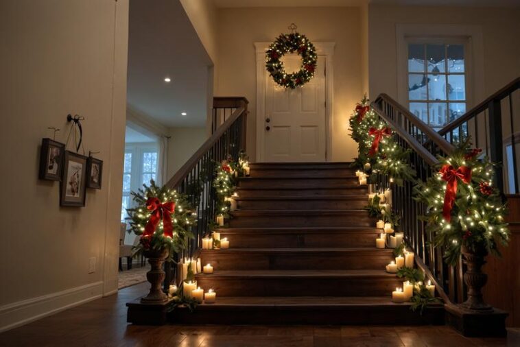 Eine Foto- und Erinnerungs-Girlande am Treppenhaus-Geländer setzt eine persönliche und festliche Note in den Eingangsbereich. Besonders in der Weihnachtszeit wird das Treppenhaus so zu einem Ort voller schöner Erinnerungen und stimmungsvollem Flair. Mit Fotos von vergangenen Weihnachten, Winterlandschaften oder familienbezogenen Momenten entsteht eine emotionale Atmosphäre, die den Besucher gleich beim Betreten des Hauses in weihnachtliche Stimmung versetzt. Die Girlande lässt sich mit Lichterketten ergänzen, wodurch ein warmer und einladender Glanz erzeugt wird. Naturmaterialien wie Tannenzapfen, kleine Holzsterne oder getrocknete Orangenscheiben komplettieren das Gesamtbild und unterstreichen den rustikalen Charme. Außerdem bietet die individuelle Gestaltung Raum für Kreativität: Fotos können mit kleinen Anhängern, Beschriftungen und Illustrationen verziert werden, wodurch die Girlande zu einem einzigartigen Highlight im Treppenhaus avanciert. Diese Kombination aus Bildern, Erinnerungen und weihnachtlicher Dekoration schafft nicht nur optischen Reiz, sondern auch eine persönliche Verbindung zur festlichen Jahreszeit.
