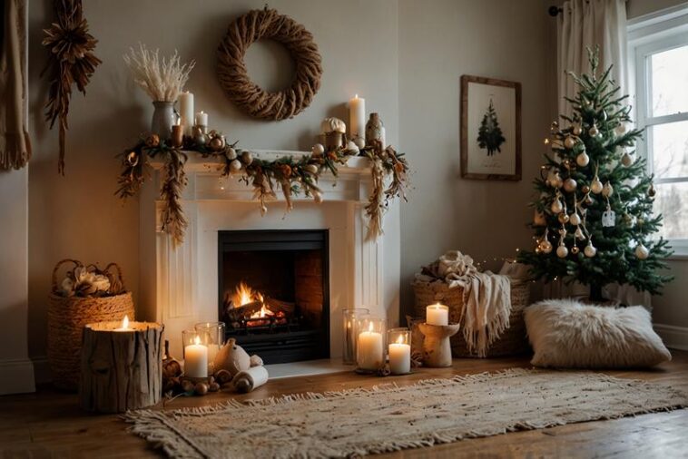 Boho Weihnachtsdeko am Kamin mit Jutegirlande und Kerzen
