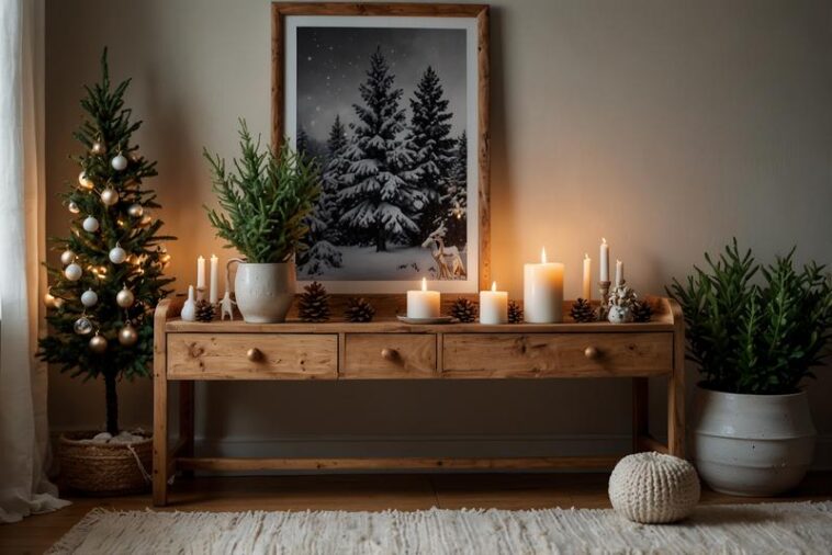 Die vielfältigen Gestaltungsmöglichkeiten für das Sideboard bieten zahlreiche Inspirationen, um die winterliche und festliche Atmosphäre stilvoll zu unterstreichen. Ob skandinavisches Hygge mit natürlichen Materialien und warmem Kerzenlicht, ein stimmungsvoller Lichterteppich oder ein Arrangement im Waldspaziergang-Stil mit Tannenzweigen und Holzfiguren – jede Dekoration schafft ein harmonisches Wohngefühl. Elegante Keramikbäume in Gold und Weiß bringen einen Hauch von Luxus, während nostalgische Vintage-Elemente und der Landhaus-Charme mit Zimtstangen und Leinen für Wärme und Gemütlichkeit sorgen. Besonders individuell wird es mit einem Tellerarrangement aus Kerzen oder einer modernen Inszenierung aus Skulptur und LED-Lichtern, die reduzierte Eleganz mit festlicher Stimmung verbinden. Persönliche Akzente setzen Familiengalerien mit Weihnachtsfotos, die dem Raum emotionale Tiefe verleihen. Spiegelnde Oberflächen und filigrane Schneeflocken verstärken das Lichtspiel und schaffen zauberhafte Momente, während kinderfreundliche Displays Sicherheit und Spielspaß vereinen. Ein duftendes Tablett mit Kiefernzapfen und Duftkerzen rundet die winterliche Dekoration ab und sorgt für behagliche Sinneseindrücke. Insgesamt laden diese vielfältigen Arrangements dazu ein, das Sideboard als kreativen und gemütlichen Blickfang zu gestalten, der in der kalten Jahreszeit Geborgenheit und festliche Stimmung gleichermaßen vermittelt.