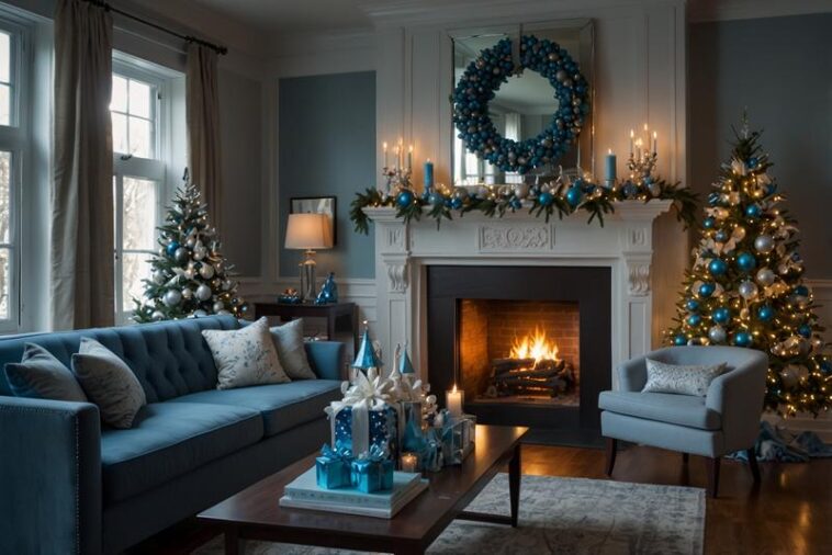 Kaminsims mit Weihnachtsdeko in Blau und Silber