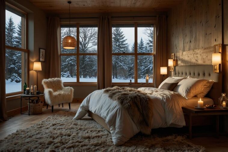 Das winterlich gestaltete Schlafzimmer wird durch gezielte Kombinationen aus warmen Textilien, natürlichen Materialien und behaglichen Lichtakzenten zu einer echten Wohlfühloase. Flauschige Plaids, Fellkissen und Schaffell-Bettvorleger schaffen nicht nur optisch, sondern auch haptisch eine gemütliche Atmosphäre, die zum Kuscheln und Entspannen einlädt. Unterstützt wird dies durch warme Daunenbettdecken mit komfortablen Toppern, die für ein wohliges Schlafklima sorgen. Elektrische Heizquellen wie Kuschelheizdecken, Infrarot-Heizpaneele oder Kaminöfen ergänzen das Wärmeangebot und tragen zu einer behaglichen Raumatmosphäre bei, ohne den natürlichen Charakter zu stören. Dicke Thermovorhänge verbessern die Wärmedämmung und erhöhen die Energieeffizienz, während warme Wandfarben und Akzentwände das Raumgefühl zusätzlich veredeln. Für eine harmonische Stimmung sorgen Stimmungslicht durch Kerzen, Laternen und dimmbare Lampen, die das winterliche Flair unterstreichen und entspannende Lichtverhältnisse schaffen. Natürliche Accessoires wie Holz- und Korb-Elemente sowie gemütliche Sitzplätze an der Fensterbank runden das Interieur ab und fördern ein natürliches, warmes Ambiente. Abgerundet wird das Gesamtkonzept durch winterliche Raumdüfte, die mit angenehmen Aromen für Wohlbefinden und Behaglichkeit sorgen. So wird das Schlafzimmer zum idealen Rückzugsort, der Komfort und Gemütlichkeit optimal verbindet und kalte Wintertage angenehm macht.