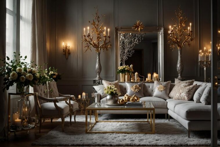 Silber und Gold: Festliche Wohnzimmer-Deko mit Kerzen und Vasen