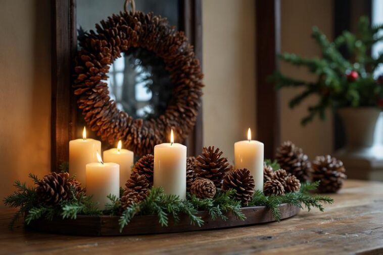 Tannenzapfen und Holz sind ideale Materialien, um eine gemütliche und natürliche Atmosphäre am Kamin oder Kaminmantel zu schaffen. Sie vermitteln Wärme und rustikalen Charme, was besonders in der kalten Jahreszeit sehr geschätzt wird. Tannenzapfen mit ihrem charakteristischen, organischen Aussehen passen perfekt zu rohem Holz, das durch seine Maserung und natürliche Farbvarianz besticht. Kombiniert entstehen daraus dekorative Arrangements, die ohne großen Aufwand viel Wirkung zeigen. Ob aufgestellt in Holzkisten, Körben oder als Teil eines Kranzes – Tannenzapfen tragen zur winterlichen Stimmung bei, ohne künstlich zu wirken. Holzstrukturen ergänzen die natürliche Optik und sorgen für harmonische Farbnuancen, die von hellen Beige- bis zu warmen Brauntönen reichen. Darüber hinaus können Tannenzapfen mit etwas Kerzenwachs fixiert werden, um auch als Kerzenhalter zu dienen. Diese Kombinationen sind nicht nur dekorativ, sondern auch nachhaltig und umweltfreundlich, da sie aus natürlichen Materialien bestehen und mehrfach verwendbar sind. So wird die Kamin- und Manteldeko zu einem echten Hingucker, der die winterliche Gemütlichkeit auf natürliche Weise unterstreicht.