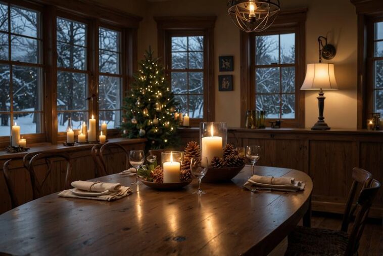 Ein beeindruckendes Kerzenmeer auf dem Esstisch schafft eine besonders gemütliche und einladende Atmosphäre, die perfekt zu langen Winterabenden passt. Die Kombination aus unterschiedlichen Kerzenarten, wie Stumpenkerzen, Teelichtern und Schwimmkerzen, erzeugt ein lebendiges Flammenspiel und bringt Wärme in den Raum. Für zusätzliche Eleganz sorgen Kerzenhalter aus Naturmaterialien wie Holz oder Stein, die rustikale Elemente ins Esszimmer einbringen und den winterlichen Charakter stärken.