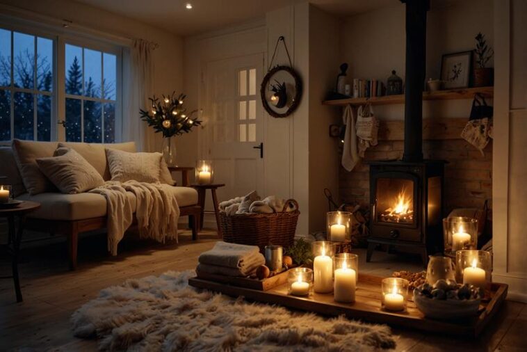 Kamin-Deko mit Holzstapeln, Kerzen und Plaids