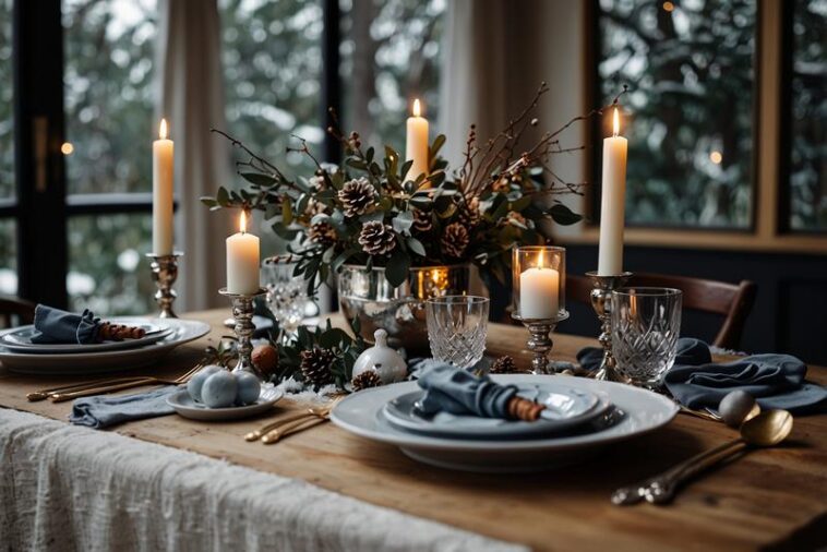 Eine zusätzliche Strickdecke, kunstvoll über die Tischkante gelegt, verstärkt das gemütliche Flair und setzt einen weichen, textilen Akzent. Strickdecken mit grober Struktur und warmen Naturtönen ergänzen den Landhausstil perfekt und sorgen für eine einladende Optik. Die Kombination der Materialien – Holz, warmes Kerzenlicht und textile Akzente – schafft eine harmonische Balance zwischen Natürlichkeit und Eleganz. Diese Dekoration eignet sich hervorragend für festliche Anlässe ebenso wie für den täglichen Wintergebrauch und bringt rustikalen Charme in jedes Esszimmer.